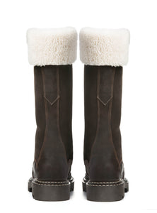 The MIKA boot blends bold styling with dependable cold-weather performance. Crafted from waterproof full-grain leather and calfskin suede, it’s fully lined with dense natural wool for lasting warmth. A plush shearling-trimmed collar adds softness and contrast. Designed without the OCsystem®, this version features a rugged lugged rubber outsole with a decorative double-welt for added structure and style. A full front lace-up and functional inner zipper ensure a secure, customizable fit. From city streets to snowy paths, the MIKA Lug Edition delivers warmth, grip, and urban sophistication.