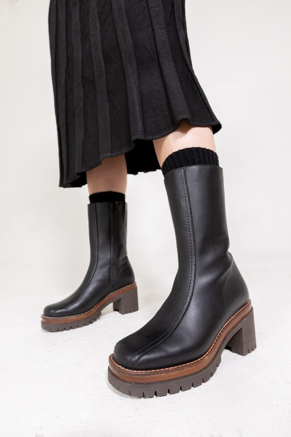 Blending bold lines with cold-weather function, the ELLIE boot makes a modern statement. Expertly crafted from waterproof full-grain leather, it’s lined with natural wool at the footbed and interior upper for targeted warmth where it matters most, while a soft microfiber lining in the shaft ensures breathability and comfort. The square toe adds architectural interest, and the block heel paired with a treaded outsole delivers both lift and winter traction. Equal parts protection and style, ELLIE is your go-to for cold-season days that call for comfort with edge.