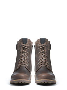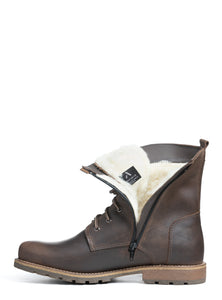 The Olivier boot blends modern refinement with functional cold-weather performance. Crafted from premium waterproof distressed leather, it features a taller silhouette with a decorative side buckle for a subtle touch of rugged character. A lace-up front and discreet inner zipper ensure a secure, adjustable fit, while the true bellows tongue keeps out snow and slush. Fully lined with dense natural wool and finished with a treaded rubber outsole, the Olivier delivers lasting warmth, traction, and understated urban sophistication.