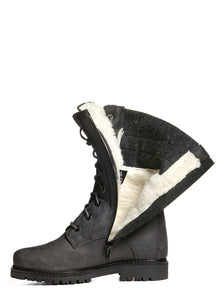 Mid-calf, full grain leather, waterproof winter boots. Round toe. Authentic handwoven Harris Tweed top collar. Natural wool lining with a density of 650g/m2. Bellows tongue to keep debris and water out. Embossed logo at tongue. Bi-colour lace-up closure. Alternate lacing included. Functional interior YKK zipper for easy on and off. 3mm natural wool lined footbed for all day comfort. Italian thermo-rubber treaded outsole.