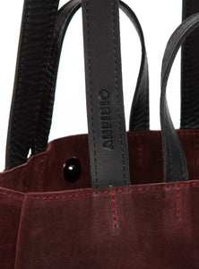 Genuine Italian suede tote bag in bordeaux colour. Twin contrasting leather carry handles at top. Pressure buttons on throat sides. Logo embossed on strap. YKK zippered pocket and silver-tone hook fastening at interior. Silver-tone hardware. Tonal cotton lining. Approx. 14.5" length x 14.5" width.