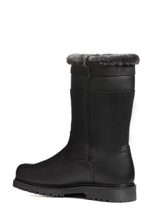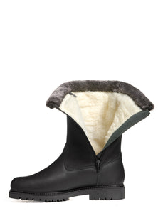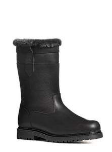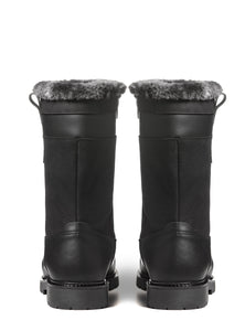 Crafted from waterproof full-grain leather, it features a smooth, buffed finish at the vamp and a subtly textured leather shaft—striking a balance between artisanal refinement and winter-ready resilience. Fully lined in natural wool, it provides breathable insulation for sub-zero conditions, while a plush shearling trim adds soft contrast and a touch of alpine luxury. Set on a treaded outsole for confident grip in snow and slush, HARFANG is rugged yet composed—built to navigate northern life, from forest trails to city streets.