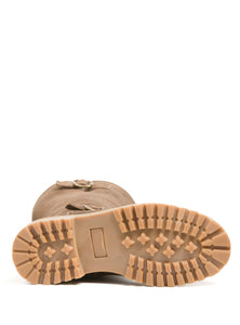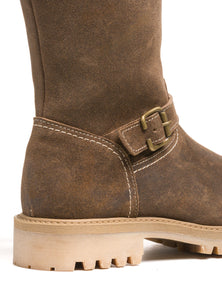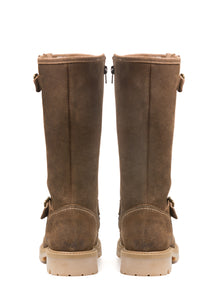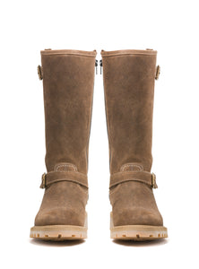 Introducing SIERRA—one of eight new styles in our elevated women’s collection and a quiet statement of our evolving artistic vision. This tall winter boot evokes grounded elegance, where sculptural simplicity meets alpine soul. Crafted in calfskin suede and fully lined in natural shearling, it offers enveloping warmth with every step. A crepe-style sole and tonal topstitching soften its rugged frame, while antique brass buckles add a whisper of vintage charm. In a rich honeyed hue, SIERRA balances form and function with rare grace. Built for women who move through winter with intention—and beauty.